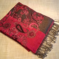 Sjal med ett unikt mönster i olika nyanser av brunt, vitt och rött. Mönstret kombinerar blommiga element med ett djurtryck.