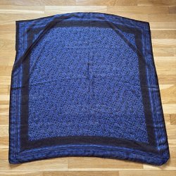 Fyrkantig sjal i olika nyanser av blått med ett mönster av koncentriska rutor och linjer. Sjalen har en mjuk och följsam kvalitet.