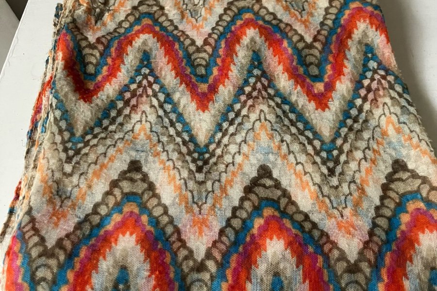 Färgglad sjal med ett distinkt vågmönster i nyanser av orange, blått, brunt och beige. Sjalen har en lätt och luftig känsla, perfekt för att addera en färgklick till din outfit.