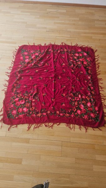 Vacker sjal med ett detaljerat blommönster i olika nyanser av rött och rosa. Mönstret täcker hela sjalen och ger den ett livfullt utseende. Sjalen har fransar längs kanterna, vilket bidrar till dess charm. Den är kvadratisk i formen och kan användas på flera sätt för att komplettera en outfit.