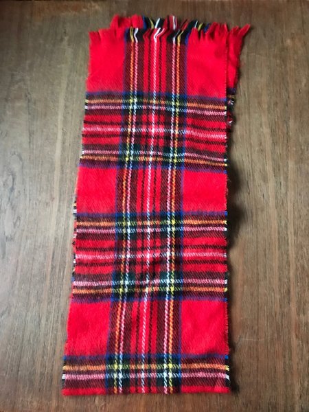 Röd scarf med ett klassiskt skotskrutigt mönster i rött, svart, vitt, gult och blått. Scarfen har fransar i ändarna .Längd 112 cm ej fransar medräknade bredd 12 cm