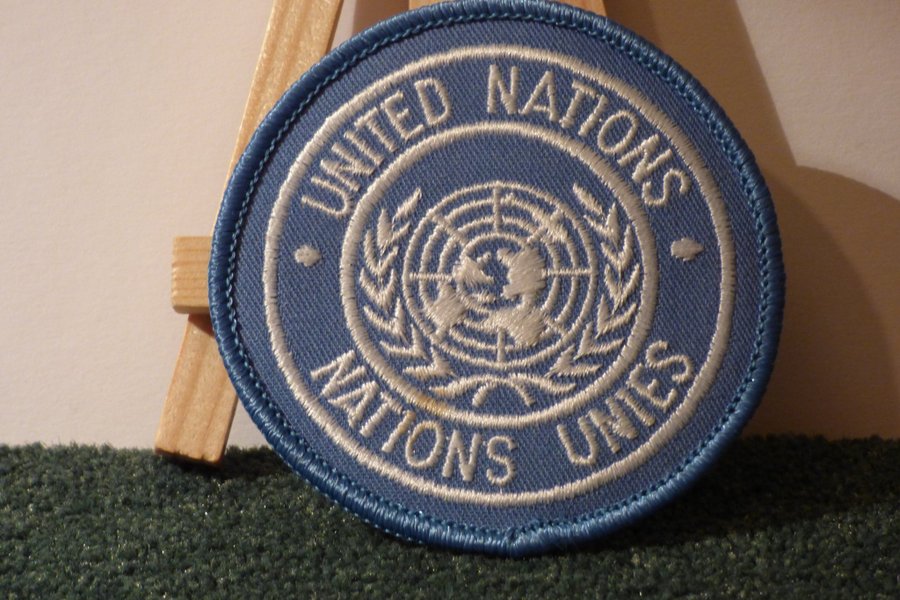 En broderad patch med FN-emblemet. Patchen är rund och har texten "UNITED NATIONS NATIONS UNIES" runt emblemet. 7 cm i diameter