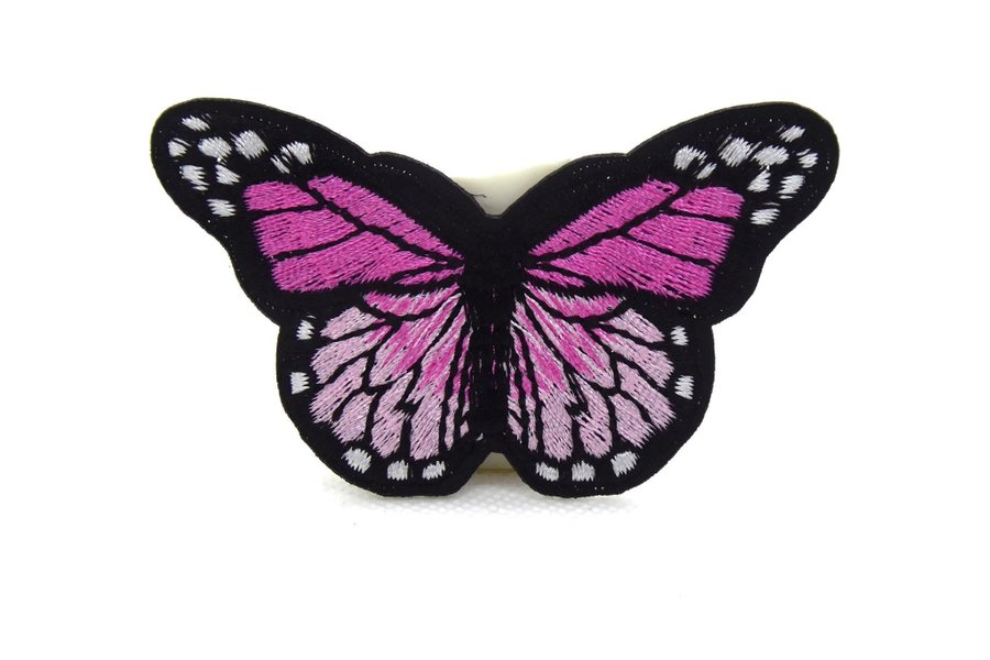 Ett broderat märke format som en fjäril. Fjärilen har svarta kanter och detaljer, med vingar i olika nyanser av rosa och lila. Det finns även vita prickar längs vingarnas kanter.