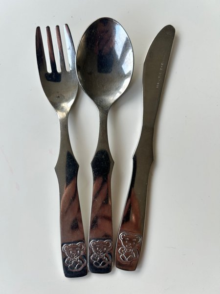 B&B bestickset med en gaffel, en sked och en kniv. Besticken har en nallebjörn på handtaget.