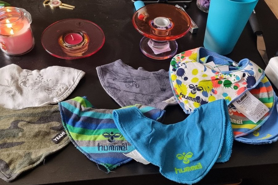 Här är ett set med haklappar i olika färger och mönster. De har tryck och detaljer.