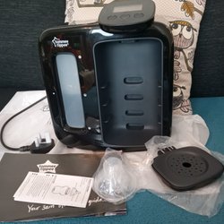 Elektrisk bröstpump som hjälper att pumpa ut bröstmjölk. Pumpen har två faser och är relativt tyst. En flaska med tillbehör medföljer, som använts vid ett tillfälle. Bröstpumpen har knappt varit använd. Instruktionsbok medföljer.
