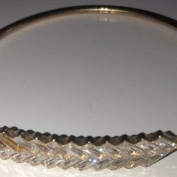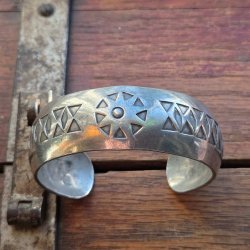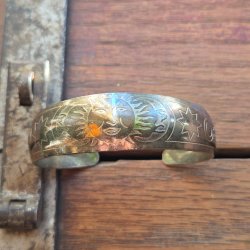 Ett armring i hamrad silvrig metalltextur med grön stendekoration.