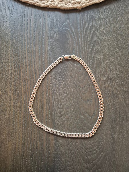 Detta är ett klassiskt silverfärgat kedjehalsband av pansarlänksmodell (kallas ofta "curb chain" på engelska). Längd 50 cm
