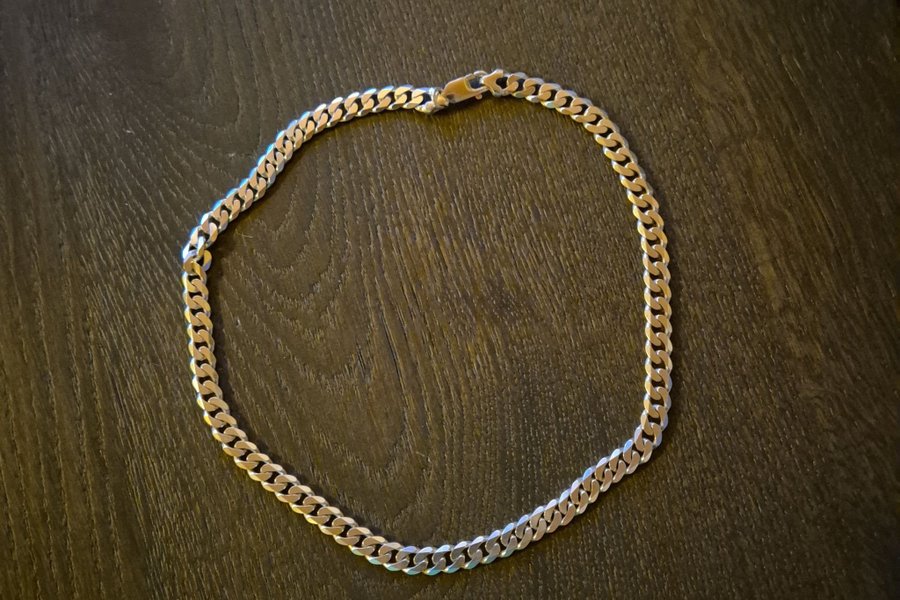 Detta är ett klassiskt silverfärgat kedjehalsband av pansarlänksmodell (kallas ofta "curb chain" på engelska). 45 cm
