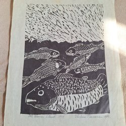 Ett linoleumsnitt med motiv av en kvinna och ett barn vid vattnet med en klippa i bakgrunden. Trycket är i svartvitt.
