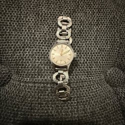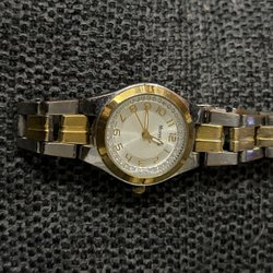 Mango digital damklocka med svart textilarmband och röd söm. Boetten är i rostfritt stål. Baksidan av boetten är märkt med Mango, Inex watches och 68142.nytt batteri mycket fint