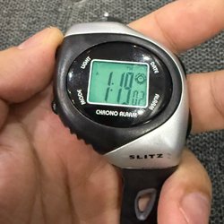 Digital armbandsur med blå detaljer och svart armband. Klockan är vattentålig (100FT).