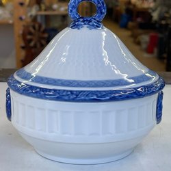 Fin skål fra Royal Copenhagen med blå dekorationer. Bemærk den fine detalje med hulmønster langs kanten. Helblonde lille brændingsfejl se billede 3 eller hel fin stand 3/sortering flot malet