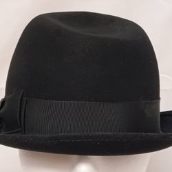 Svart hatt med en liten rosett på sidan. Hatten har en klassisk form med en rundad kulle och en uppvikt brätte.