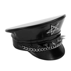 Svart hatt med ett brett brätte. Brättet är dekorerat med månfaser i vitt, vilket ger en distinkt kontrast mot den svarta bakgrunden. Hattens krona är rundad och har en klassisk form.