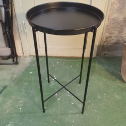 Ett silverfärgat bord med en bricka som bordsskiva och hopfällbara ben. Perfekt som bord på balkong, altan eller extra sidobord vid behov. Ca 80 cm/diam.