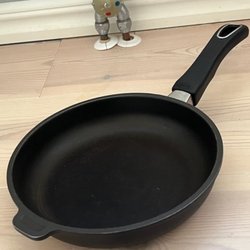 Stekpanna med non-stick beläggning och ett handtag i rostfritt stål.
