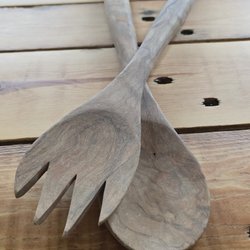 Tre sæt salatbestik. Et sæt i træ med zebraer fra (Afrika), et sæt i rød plast (Dansk) og et sæt i sort med mahogni (Dansk).