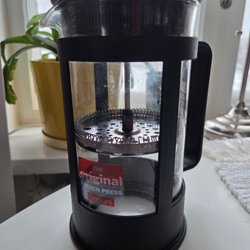 Presskanna för kaffe. Kannan är i glas med svart handtag och lock. Den har en metallkolv med filter.