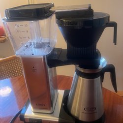 Kaffebryggare från Moccamaster. Modellen är Technivorm. Bryggaren har en kapacitet på 1,25 liter, vilket motsvarar 10 koppar. Den är utrustad med en kalkindikator och har en effekt på 1520W. Bryggaren är godkänd av European Coffee Brewing Centre. I princip helt oanvän då vi har dubletter i hemmet.