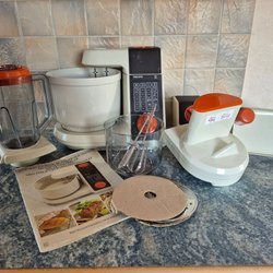 Philips köksmaskin av modellen Storemaster electronic. Denna maskin kommer med diverse tillbehör för att underlätta matlagningen.