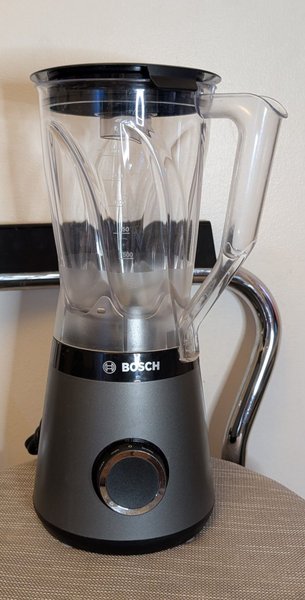 Bosch blender med en kanna som har en kapacitet på 1500 ml. Blendern har en vridreglage för att justera hastigheten från min till max, samt en pulsfunktion.