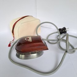 Moulinex Chronomate 20 strykjärn. Modellen har en vit och turkos design med en sladd lindad runt handtaget. Strykjärnet har en slät stryksula med flera ånghål och en temperaturratt.