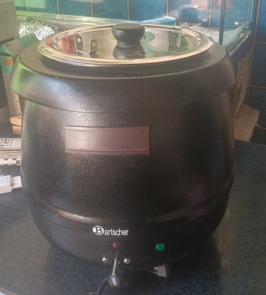 Soppvärmare från Bartscher. Denna modell är designad för att hålla soppor och liknande rätter varma. Den har en svart exteriör och ett lock med handtag. Enheten är utrustad med en strömbrytare och indikatorlampor.