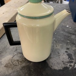 Vit Kockums kanna med gröna blad. Märkt med 1,5 liter. Färgen borta på locket nederkant