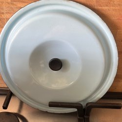 Emaljerad skål från Kockums. Skålen är 34 cm i diameter och rymmer 5,5 liter. Rejält bruksslitage med rost och nagg, se foton.
