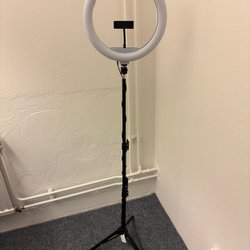 Säljer en ring light med stativ. Perfekt för videosamtal, fotografering eller sminkning. Lätt att justera ljusstyrkan och olika ljus (kallt, varmt osv). Stativet är justerbart i höjd. USB-kontakt