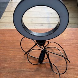 Säljer en ring light med stativ. Den har en justerbar telefonhållare och en USB-kabel med kontrollpanel för att justera ljusstyrkan.