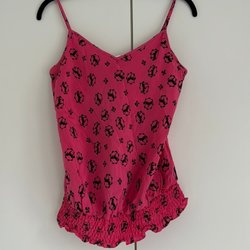 Rosa linne med smala axelband och ett dekorativt nätparti på ryggen. Linnet har en lös passform och en lätt, luftig design. MÅTT: LENGDE = 86cm. BREST OMKREST = 52cm x 2.