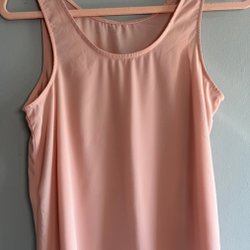 Rosa linne utan ärmar i storlek S. Linnet har en rund halsringning och inga armar.