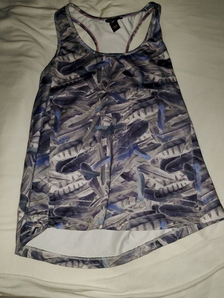 Linne med ett unikt fjäderliknande mönster i grå och blå nyanser. Den har en sportig racerback-design.