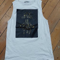 Vitt linne med smala axelband och en enkel, rak design. Plagget har en rundad halsringning och en diskret vågig kant nedtill. Passar bra för en avslappnad stil eller som ett basplagg.