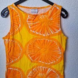 Orangefärgat linne i storlek XS, med V-ringning och guldfärgade kedje-detaljer som axelband. Kommer från djur- och rökfritt hem, använd ett fåtal gånger.