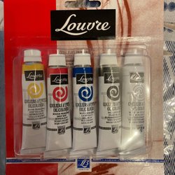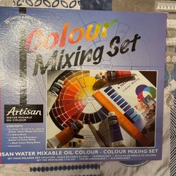 Ett kit för att komma igång med oljemålning, 2 penslar, 3 dukpannå och en avrivningsbar palett. Penslarna är oanvända, toppen på paletten är skadad av tejp, men det påverkar inte funktionen. Pannåerna har några små fläckar, se bilder noggrannt.