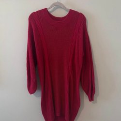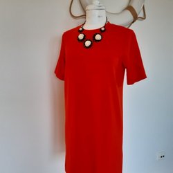 Röd klänning från The Kooples Paris Klänningen har en v-ringning och korta ärmar med volangdetaljer. Den har en röd dragkedja baktill och en volang i midjan. Klänningen har ett rött foder. Armhåla till armhåla liggandes rakt över ca 50 cm