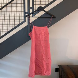 Rosa klänning med smala axelband och en figurnära passform. Klänningen har en avskärning i midjan.