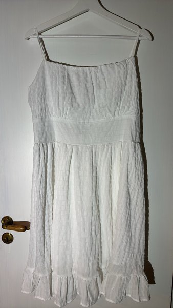 Vit klänning med smala axelband och resår under bysten. Klänningen har en våfflad struktur och en volang nedtill.