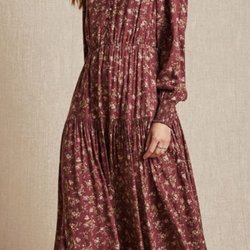 Vinröd klänning med ett blommigt mönster. Klänningen har en rund halsringning och korta ärmar med volang. Det finns ett band i midjan som kan knytas som man vill
