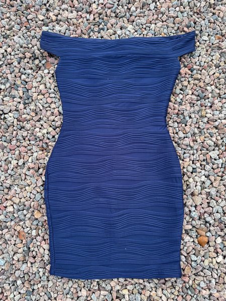 Elegant, mörkblå klänning med en unik, vågig textur. Klänningen har en smickrande passform och en axelbandslös design.