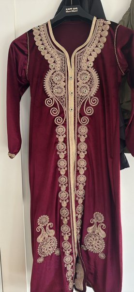 Elegant klänning i en djup vinröd färg med intrikata guldfärgade broderier längs framsidan och ärmsluten. Klänningen har långa ärmar och en v-ringad hals med en knappslå. Broderierna inkluderar detaljerade mönster och små pärlor som ger en lyxig känsla. Klänningen är designad med en rak passform som faller vackert.