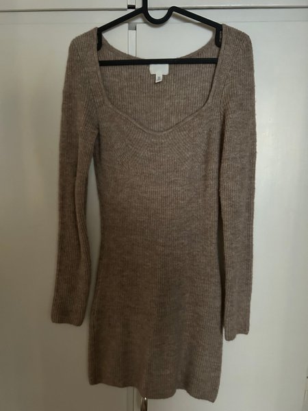 Beige stickad klänning med långa ärmar och en fyrkantig halsringning. Klänningen har en figurnära passform.