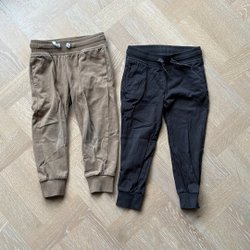 Ett par gråa mjukisbyxor och ett par blå/svarta arbetsbyxor med resår i midjan.