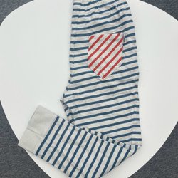 Ett par mörkblå byxor med resår i midjan och dragsko. Byxorna har ett mönster med stjärnor och vimplar i guld och vitt. De har även fickor fram.
