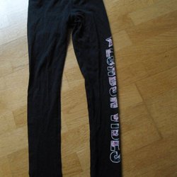Ett par mörkblå byxor med resår i midjan och en knapp. Byxorna har en liten ficka bak.