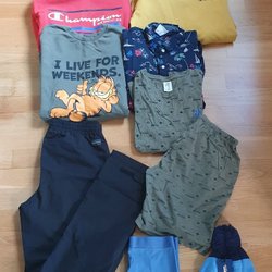 Detta är ett klädpaket med blandade kläder. I paketet ingår hoodies, tröjor, byxor och boxershorts i olika färger och stilar. Bland annat finns en grön hoodie med tryck, en blå tröja med Sonic-motiv, en svart Puma hoodie och flera par boxershorts med olika mönster.