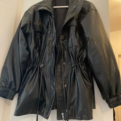 Detta är ett klädpaket för baby. Det innehåller en ny svart jacka med luva, en Ralph Lauren vit sparkdräkt med broderi, en body med tryck, ett par jeans och en blå cardigan.